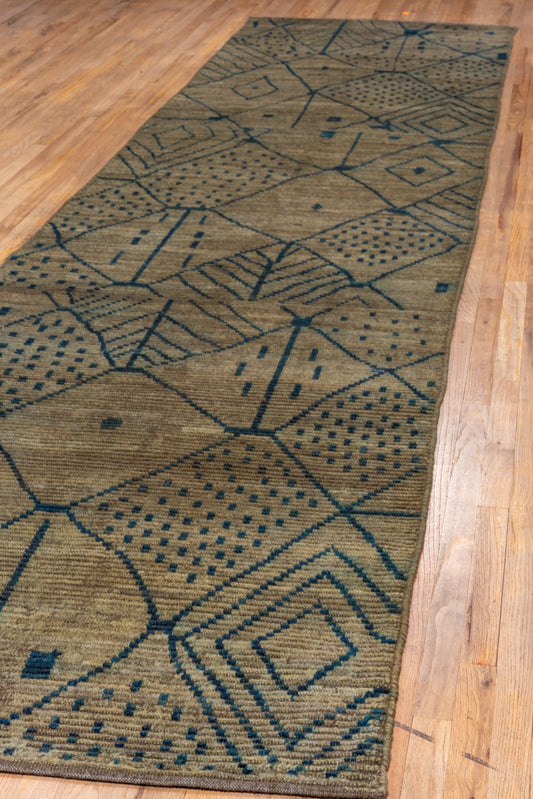 Moroccan Handmade Runner 4 X 16 |GREEN, Brown, Blue| Hand Knotted (1802)