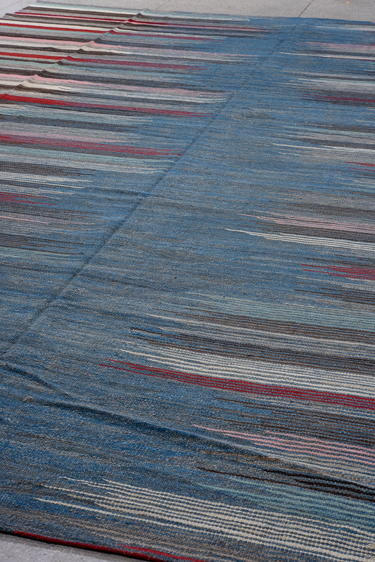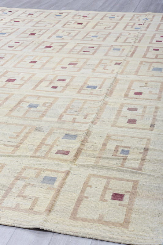 Modern Kilim flat weave | 13 x 15 | Area Rug | tribal design | Blue, Beige, Dark Red | hand woven (3368)