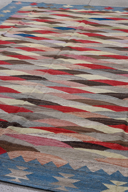 Modern Kilim flat weave | 13 x 16 | Area Rug | tribal design | red, pink, brown, beige, grey, blue, sky blue | hand woven (5034)